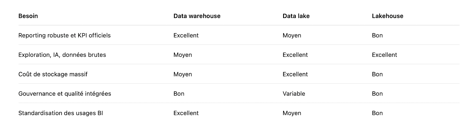Un data warehouse est adapté aux données structurées, au reporting réglementaire et aux analyses historiques.