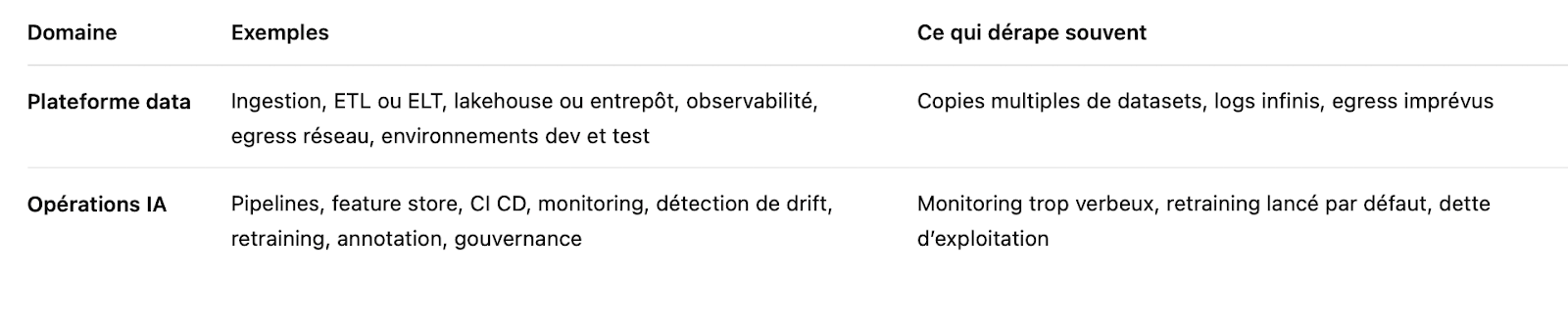 À l’échelle, ce sont souvent les dépenses invisibles qui explosent. Environnements éphémères oubliés, duplication de données par confort, surprovisionnement par prudence. Du côté des cas d’usage génératifs, le volume d’appels et de logs peut rapidement peser si rien n’est cadré dès le départ.