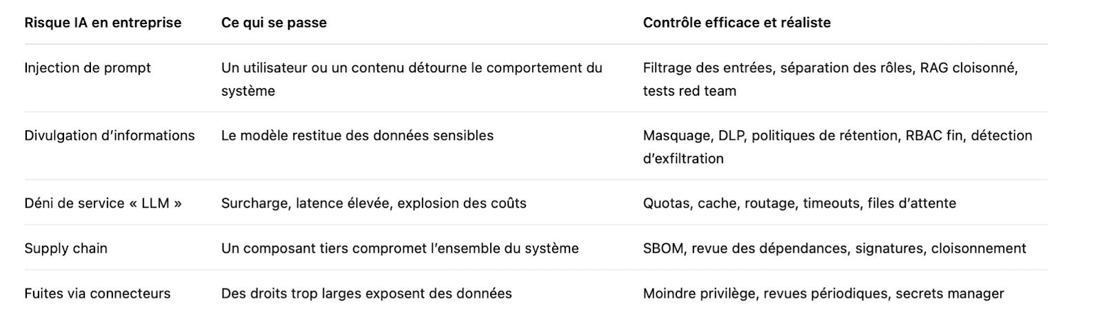 Prenons un exemple très concret. Un assistant interne est connecté à des documents RH. Un utilisateur colle un prompt piégé ou un document contenant une instruction dissimulée. Le système peut alors « obéir » et révéler des informations sensibles. Ce type de scénario est largement documenté dans les risques liés aux LLM : injection de prompt, divulgation d’informations, vulnérabilités de la supply chain. L’OWASP publie d’ailleurs un Top 10 spécifiquement dédié aux applications LLM. Ces risques ne sont plus théoriques. Ils sont déjà observés en production.