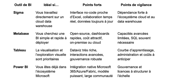 Le marché propose de nombreuses solutions de business intelligence, parmi lesquelles Power BI, Tableau, Qlik, Sigma ou Metabase. Ces outils permettent de connecter différentes sources de données, de créer des tableaux de bord interactifs et de produire du reporting adapté aux besoins métiers.