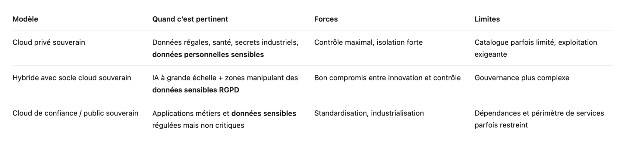 Selon les cas, ces contraintes concernent le catalogue de services disponibles, les capacités d’intégration ou encore la maturité de certains services avancés. Ces limites sont rarement bloquantes, mais elles doivent être anticipées dans la gestion des données sensibles et dans la stratégie d’architecture.